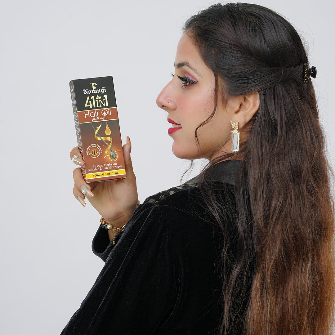 Norangi 41-in-1 Hair Oil is a unique blend of 41 pure herbal extracts carefully selected to nourish, strengthen, and revitalize your hair from root to tip. Formulated with age-old herbal secrets and modern expertise, this luxurious oil penetrates deep into the scalp to reduce hair fall, promote growth, and restore shine for healthier, thicker, and more vibrant hair.