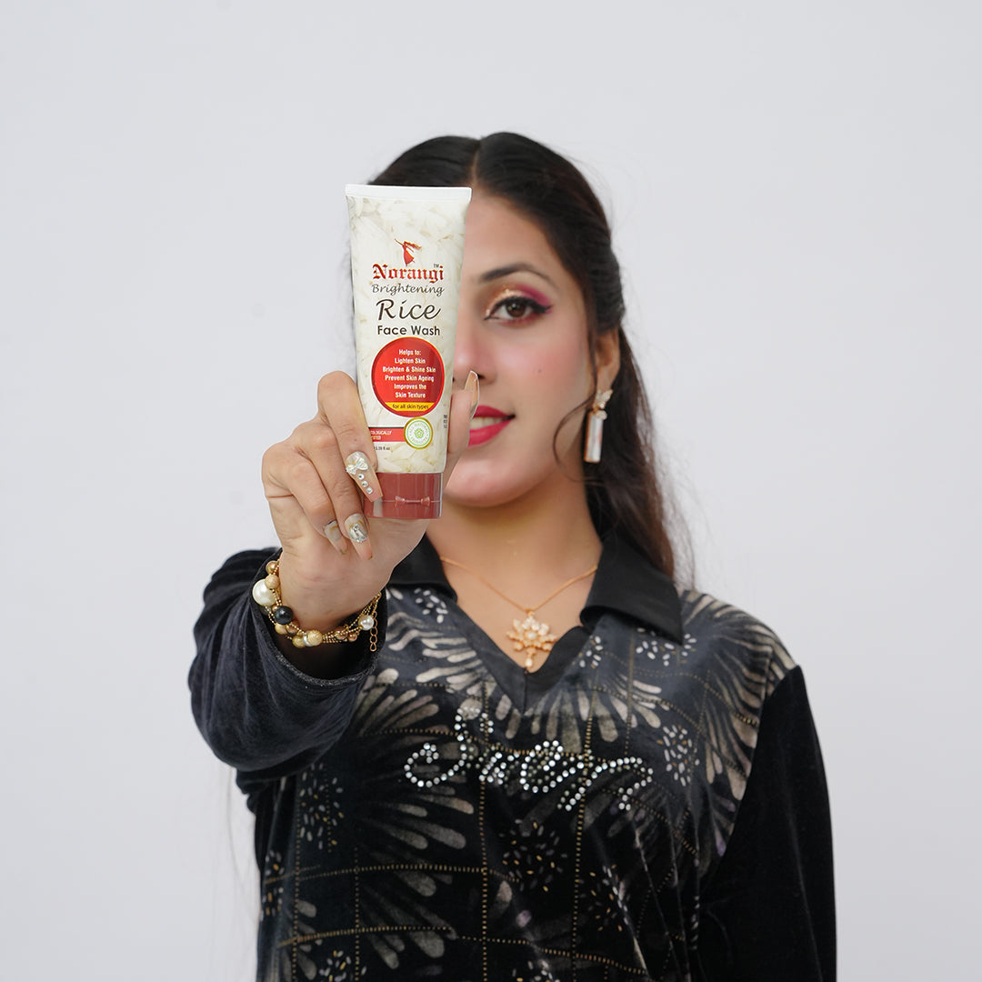 Unveil radiant, youthful skin with Norangi Brightening Rice Face Wash—powered by the purity of Rice Extract, Niacinamide (Vitamin B3), Glycerin, Aloe Vera, and Green Tea. This gentle yet effective cleanser targets dullness, rough texture, and early signs of aging—leaving your skin soft, luminous, and naturally glowing.